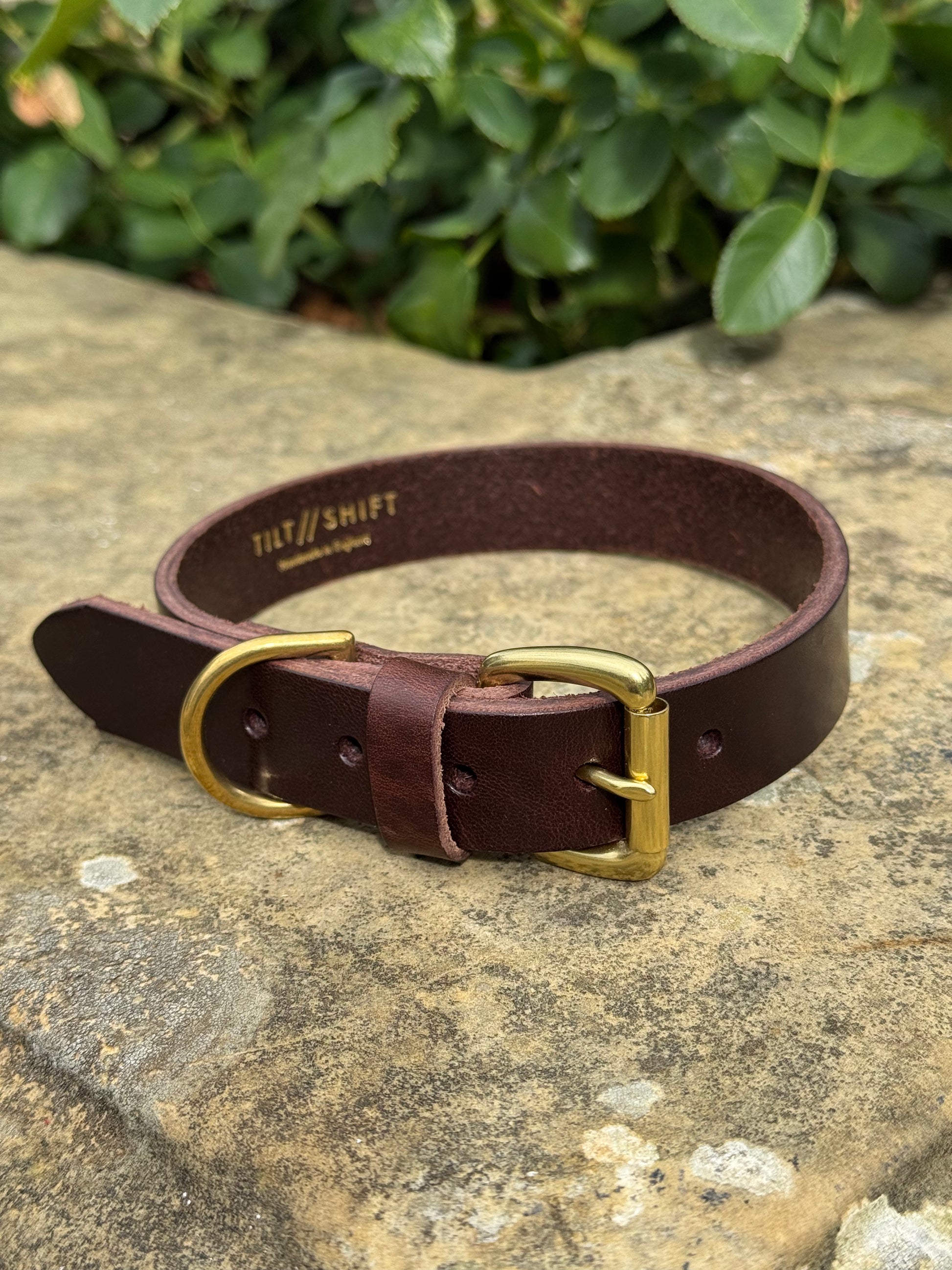 Handmade from 3.5mm thick vegetable tanned leather with sturdy solid brass buckle and D-ring. Available in Black, Brown, Tan or Navy.